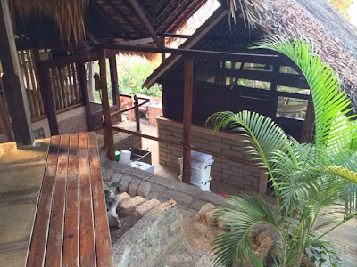 More twists and turns switch backs steep hills dogs kids on bikes horses and yes we saw a pig or two and eventually a skunk. But we made it here just fine and folks were sitting out on the porch, already in hammocks. Six more that had arrived prior to us and were already settled in. The porches are amazing and there are stone steps connecting everything on different levels. There are several separate huts, well constructed and open to the air but with mosquito screens. It's very eco friendly and designed with minimal impact on the environment in mind. Most of the water is from collected rain in cisterns.